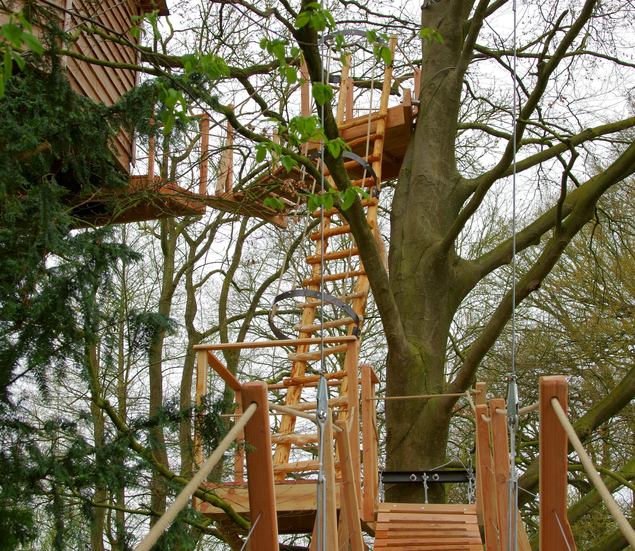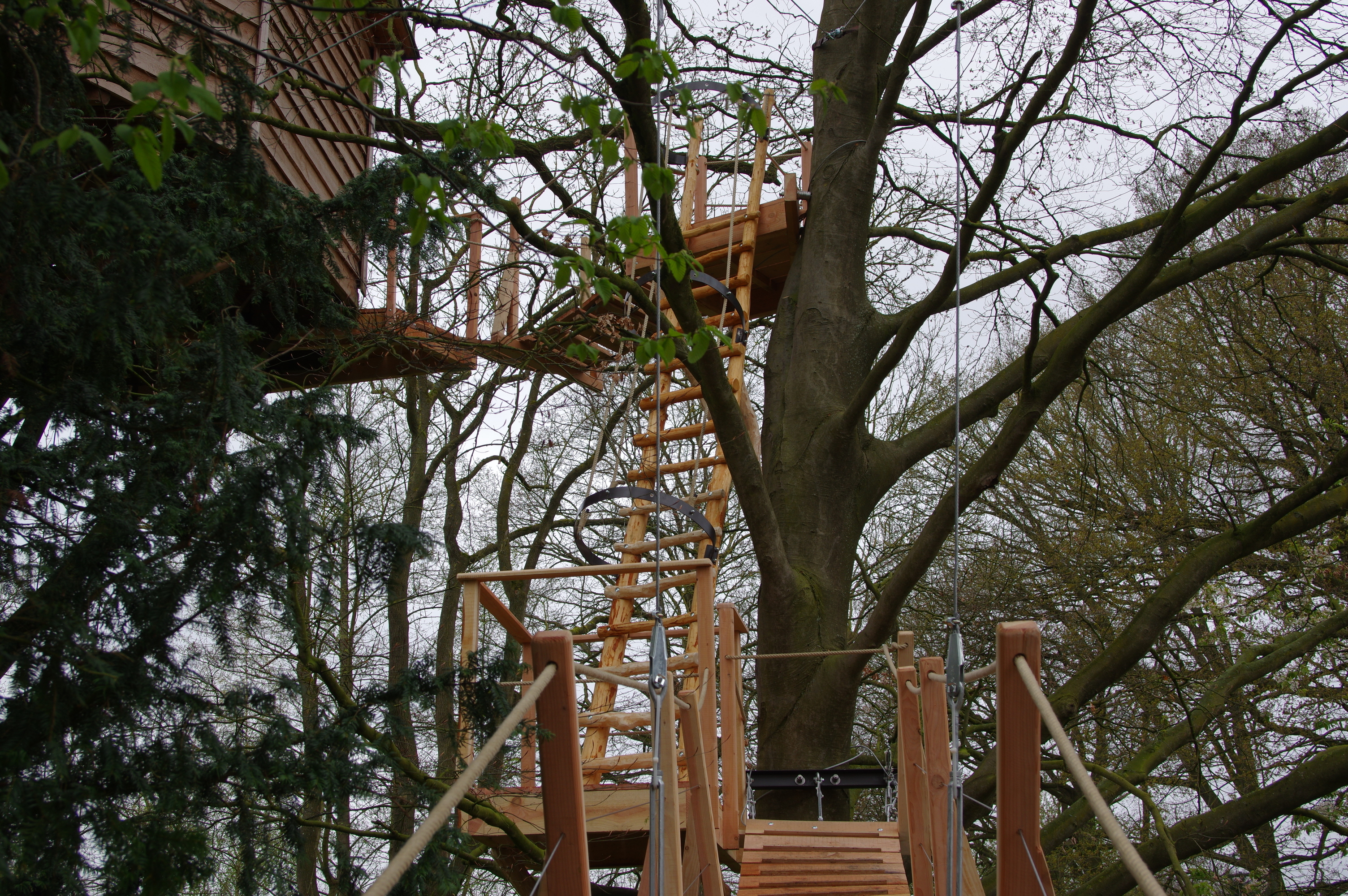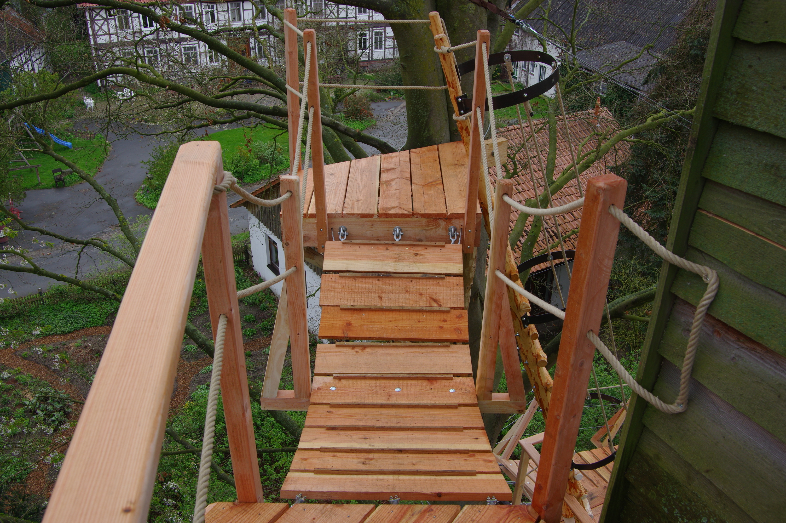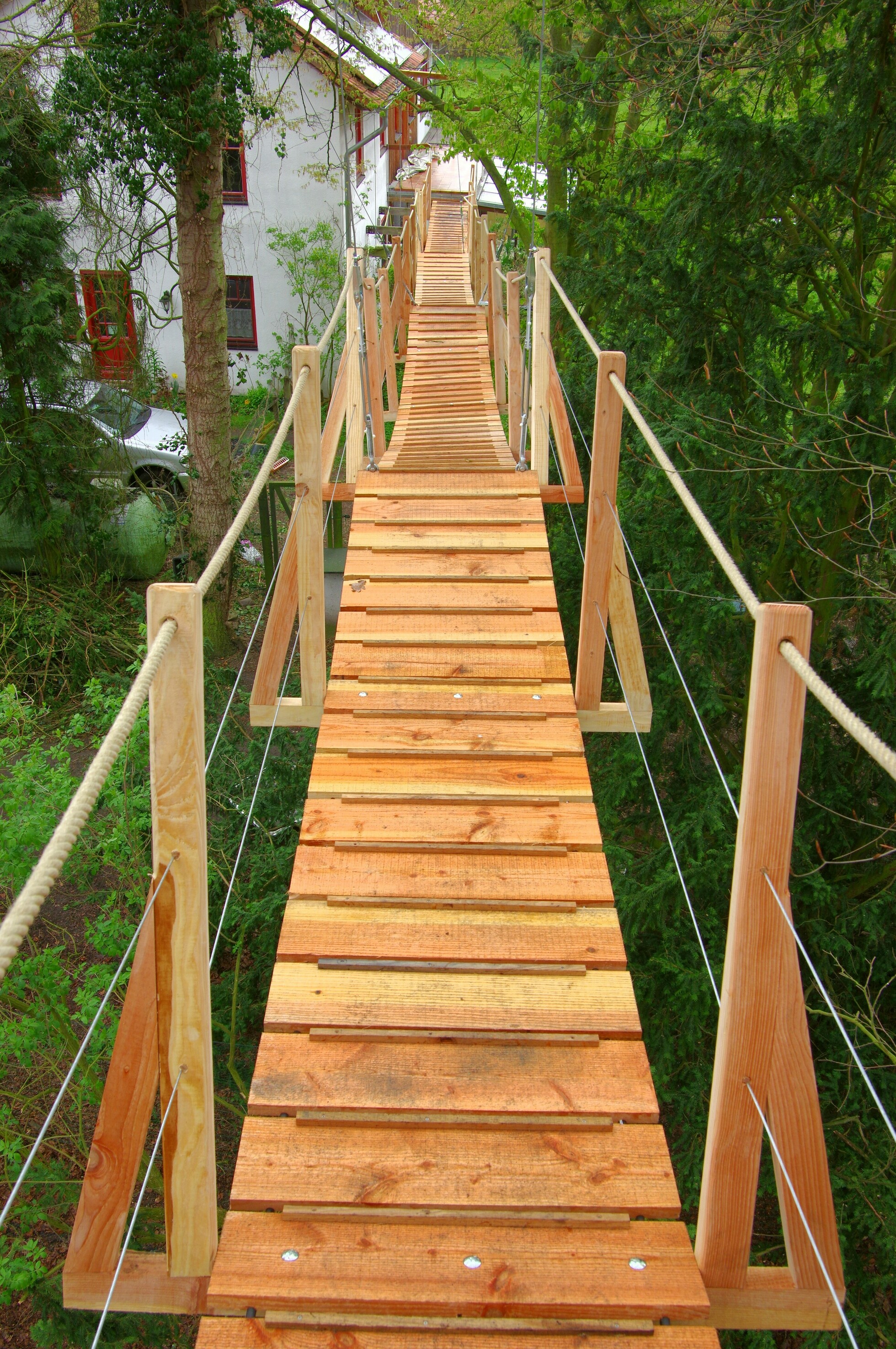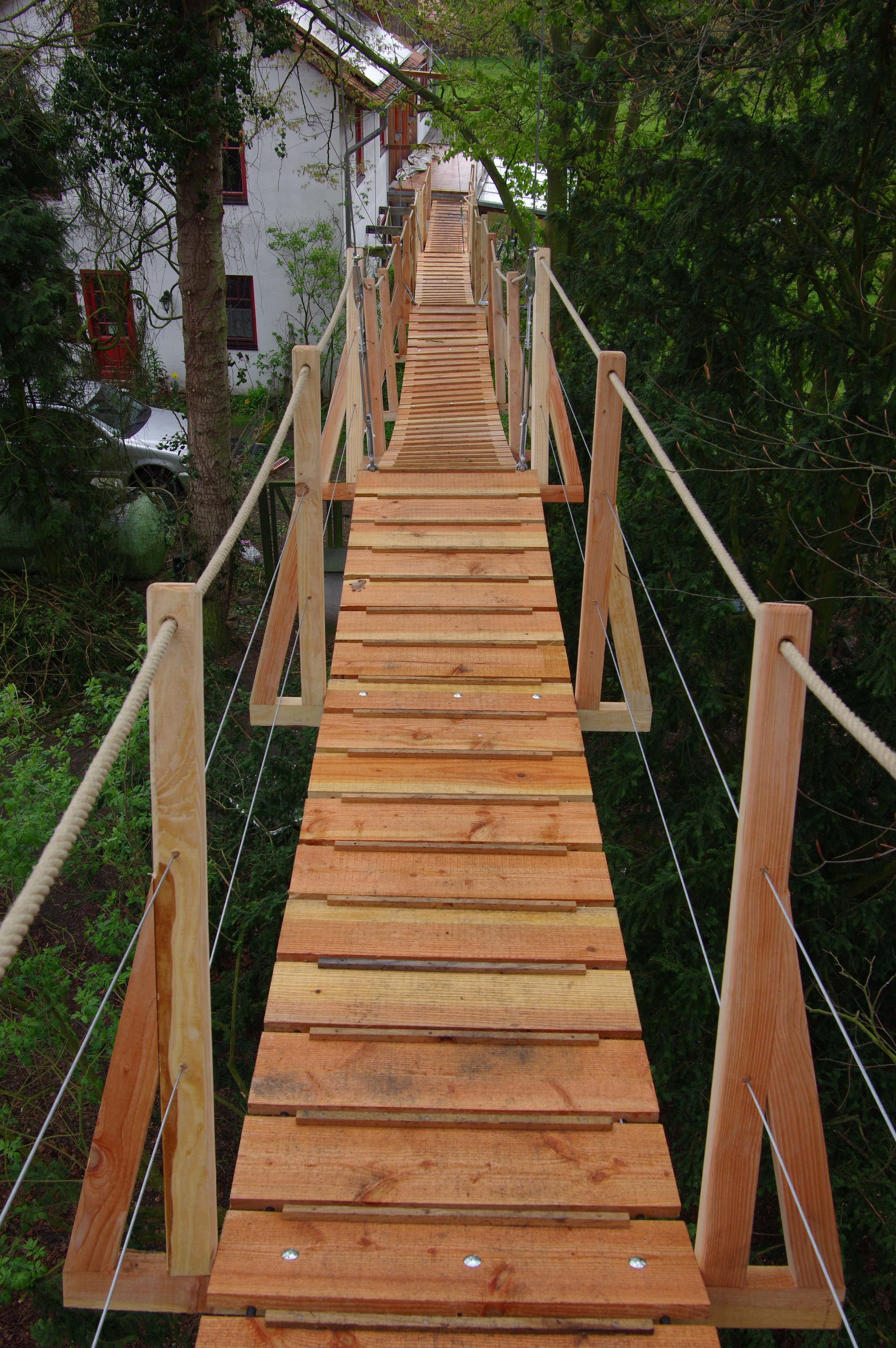 Nach einigen Jahren kam der Wunsch auf von dem Balkon des Wohnhauses aus zu Fuß zum Baumhaus gelangen zu können. Darauf hin entwarfen wir eine 30 Meter lange Hängebrücke, die sich an mehreren Bäumen entlang zu einer großen Buche emporschlängelt. Dort führt noch eine kleine Leiter und eine weitere Hängebrücke zur Terrasse des Baumhauses in der Eiche.